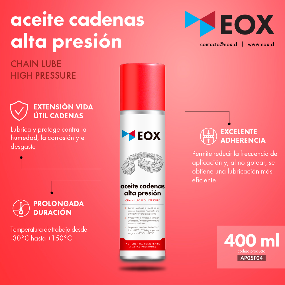 EOX Aceite de Cadenas es un lubricante de alto rendimiento para cadenas utilizadas en maquinarias y líneas de producción. Prolonga la vida útil de estas ya que lubrica y desplaza el agua eficazmente, formando una capa protectora contra la humedad, la corrosión y el desgaste. Su temperatura de trabajo es entre -30°C y 150°C, resiste a altas presiones y gracias a su excelente adherencia, es posible reducir la frecuencia de uso. Este aerosol se puede aplicar en espacios estrechos y, al no gotear, permite obtener una lubricación eficiente.
