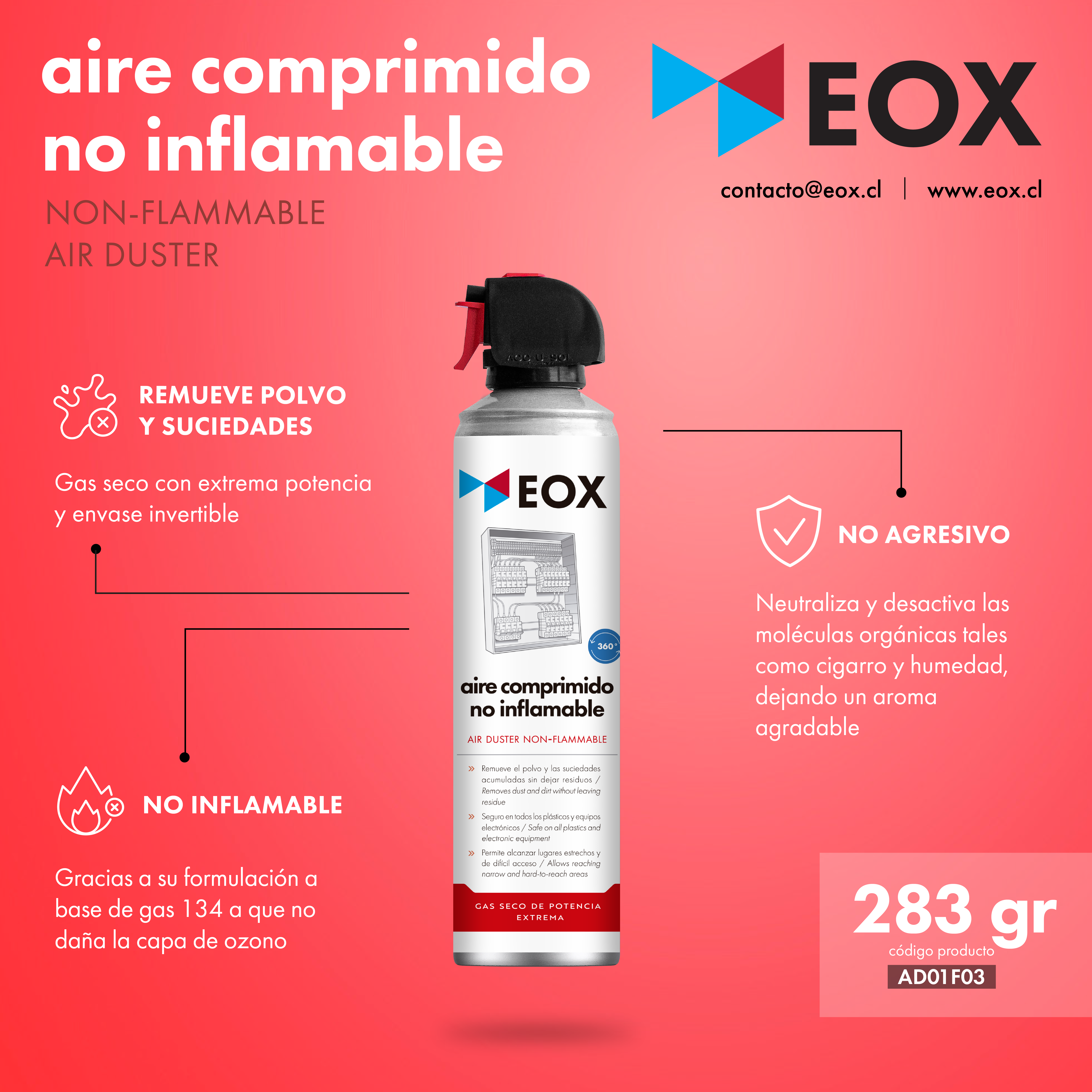 EOX Aire Comprimido No Inflamable Air Duster Non-Flammable es un gas seco de alta potencia disenado para remover facilmente polvo y suciedades. Posee una valvula especial invertible que permite limpiar lugares estrechos y/o dificil acceso. Puede ser aplicado en componentes electricos y electronicos, partes y piezas sucias, computadores, equipos de laboratorio, equipos de audio y , entre otros.