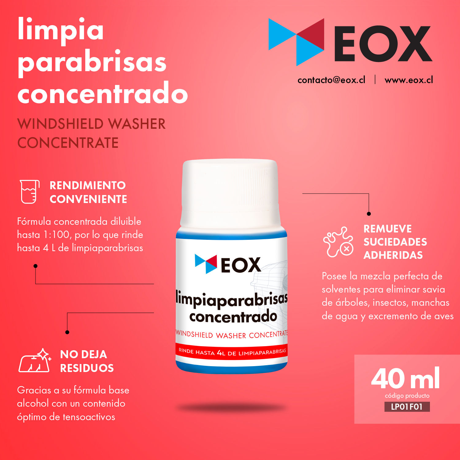 EOX Limpiaparabrisas Concentrado Windshield Washer Concentrate es un aditivo limpiador altamente concentrado para el deposito del liquido limpiaparabrisas. Elimina residuos de aceite, materia organica e insectos sin dejar rastros, dejando el parabrisa con una clara y nitida visibilidad para el conductor.